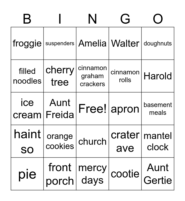 This bingo card has a free space and 24 words: orange cookies, front porch, cinnamon graham crackers, pie, doughnuts, froggie, filled noodles, suspenders, apron, church, cinnamon rolls, ice cream, crater ave, mantel clock, cherry tree, cootie, basement meals, Amelia, Harold, Aunt Freida, Aunt Gertie, haint so, Walter and mercy days.