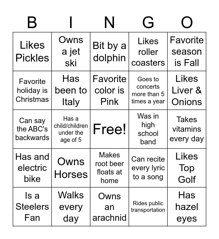 This bingo card has a free space and 24 words: Owns Horses, Walks every day, Favorite color is Pink, Is a Steelers Fan, Favorite season is Fall, Likes Pickles, Favorite holiday is Christmas, Owns a jet ski, Was in high school band, Makes root beer floats at home, Goes to concerts more than 5 times a year, Can say the ABC's backwards, Can recite every lyric to a song, Likes Top Golf, Has been to Italy, Rides public transportation, Takes vitamins every day, Bit by a dolphin, Likes Liver & Onions, Has a child/children under the age of 5, Has hazel eyes, Has and electric bike, Likes roller coasters and Owns an arachnid.
