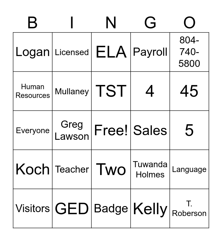 This bingo card has a free space and 35 words: Development, None, 16, Mullaney, Two, Payroll, Human Resources, Brian Holland, TST, Mathew Schneider, Everyone, 804-740-5800, S. Jackson, Kristen Owens, Logan, Sales, Kelly, Greg Lawson, Koch, T. Roberson, Tuwanda Holmes, Visitors, Language, GED, ELA, 45, 804-328-4095, Nine Mile, 4, 5, Nobody, Badge, Teacher, Licensed and Angela Helms.