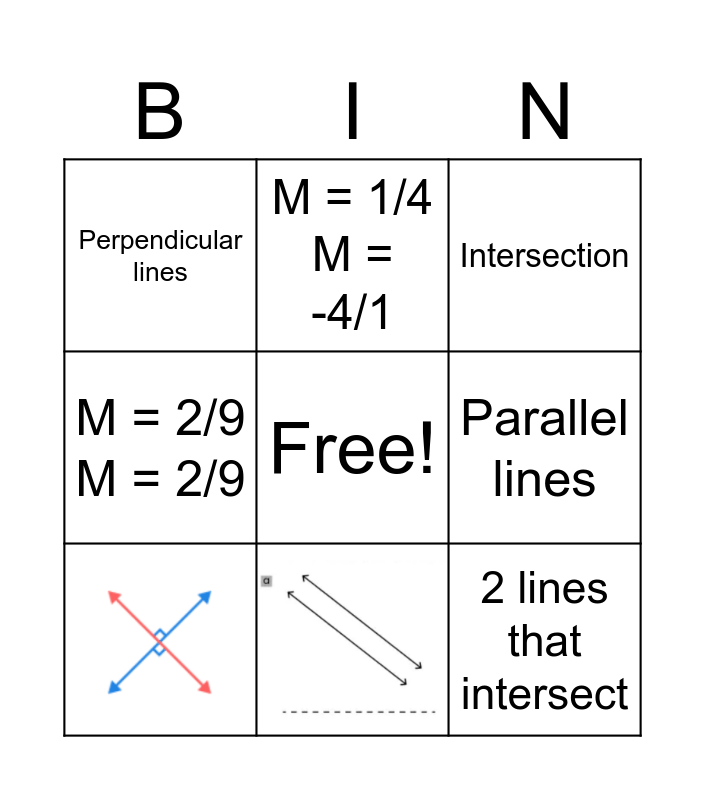 This bingo card has 2 images, a free space and 6 words: Parallel lines, Intersection, M = 1/4 M = -4/1, Perpendicular lines, 2 lines that intersect and M = 2/9 M = 2/9.