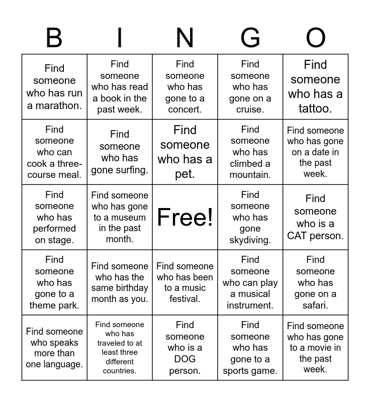This bingo card has a free space and 24 words: Find someone who has the same birthday month as you., Find someone who has traveled to at least three different countries., Find someone who has a pet., Find someone who speaks more than one language., Find someone who has a tattoo., Find someone who has run a marathon., Find someone who can cook a three-course meal., Find someone who has read a book in the past week., Find someone who has gone skydiving., Find someone who has been to a music festival., Find someone who has climbed a mountain., Find someone who has performed on stage., Find someone who can play a musical instrument., Find someone who has gone on a safari., Find someone who has gone surfing., Find someone who has gone to a sports game., Find someone who is a CAT person., Find someone who has gone to a concert., Find someone who has gone on a date in the past week., Find someone who has gone to a museum in the past month., Find someone who has gone to a movie in the past week., Find someone who has gone to a theme park., Find someone who has gone on a cruise. and Find someone who is a DOG person..