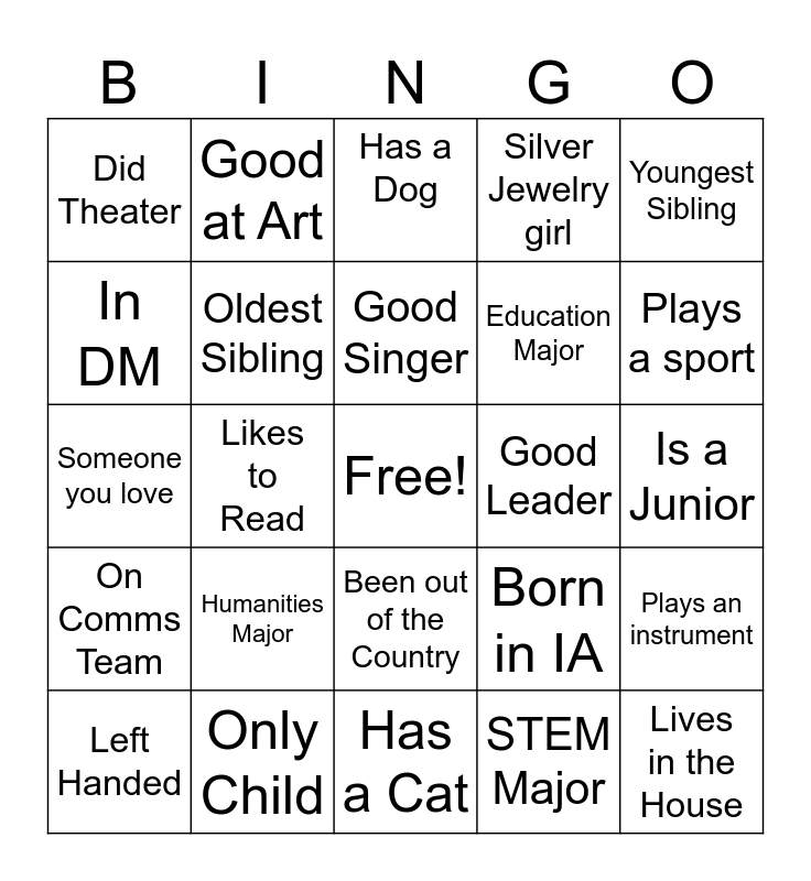 This bingo card has a free space and 29 words: Left Handed, Business Major, Likes to Read, On Membership Team, Did Theater, Has a Dog, Oldest Sibling, Humanities Major, Good Leader, Only Child, Is a Junior, Lives in the House, Has a Cat, STEM Major, Plays a sport, Has a job, Been out of the Country, On Comms Team, Youngest Sibling, Someone you love, Born in IA, Loves Coffee, Education Major, In DM, Silver Jewelry girl, Good at Art, Plays an instrument, Good Singer and Works Out.