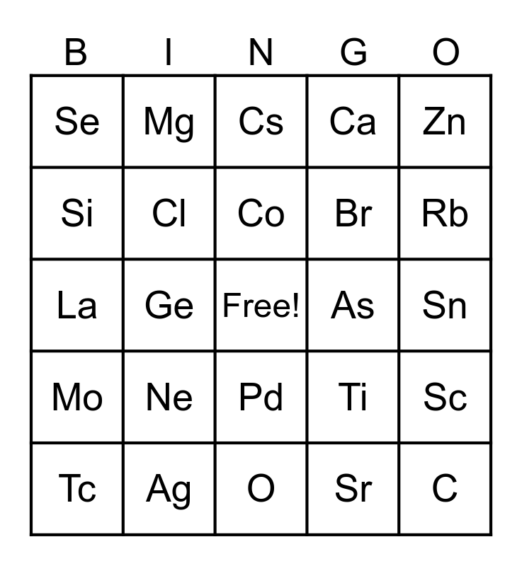 This bingo card has a free space and 48 words: Be, C, N, O, Ne, Na, Mg, Al, Si, S, Cl, Ca, Sc, Ti, Ni, Ga, Co, As, Cu, Zn, Ge, Sr, Se, Br, Nb, Rb, Tc, Zr, Pd, Mo, Cd, Ru, Rh, Sb, Ag, I, In, Sn, Ba, Te, Ce, Xe, Cs, He, La, Pr, H and V.