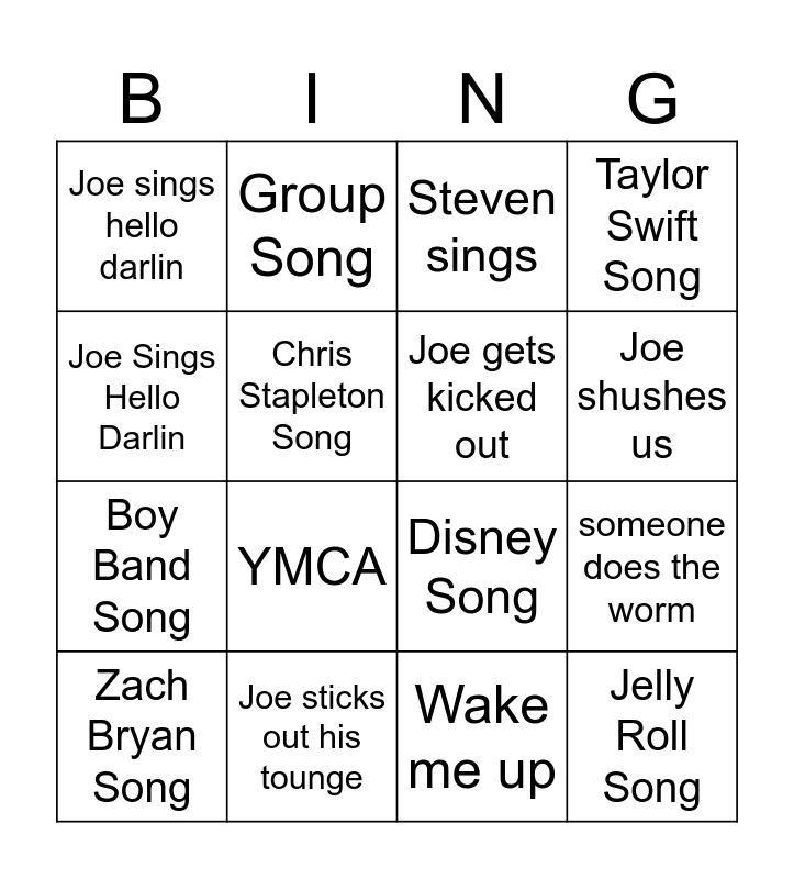 This bingo card has 21 words: Joe sticks out his tounge, A kid sings, Group Song, Hymn, Wake me up, Joe gets kicked out, Joe sings hello darlin, Steven sings, Disney Song, Joe shushes us, Boy Band Song, Taylor Swift Song, Jelly Roll Song, Joe plays air guitar, Chris Stapleton Song, Someone Throws up, Zach Bryan Song, YMCA, Joe Sings Hello Darlin, someone does the worm and random couple dancing.