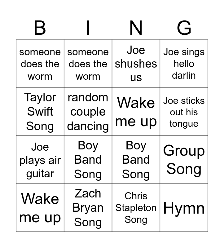 ⚠ This card has duplicate items: Taylor Swift Song (3), Group Song (2), Hymn (2), Wake me up (2), Joe gets kicked out (2), Joe sings hello darlin (2), random couple dancing (2), Disney Song (2), Joe shushes us (2), Boy Band Song (2), Jelly Roll Song (2), Joe plays air guitar (2), someone does the worm (2), Zach Bryan Song (2)