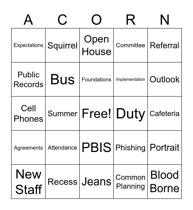 This bingo card has a free space and 29 words: New Staff, Welcome, Summer, Olympics, Expectations, Open House, Bus, Attendance, Duty, Recess, Cafeteria, Blood Borne, Jeans, Common Planning, Outlook, Instant Connect, PBIS, Agreements, Referral, Cell Phones, Phishing, Bridges, Implementation, Public Records, Committee, Squirrel, Portrait, Foundations and Maximum Learning.