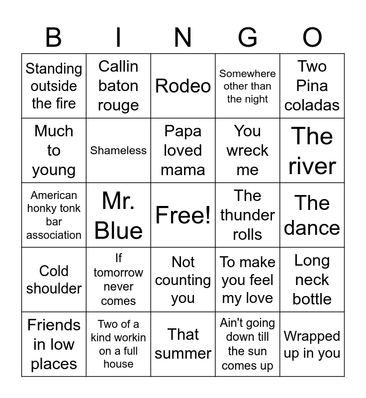 This bingo card has a free space and 24 words: Friends in low places, If tomorrow never comes, Papa loved mama, Ain't going down till the sun comes up, Two Pina coladas, Standing outside the fire, Callin baton rouge, Rodeo, The thunder rolls, The dance, American honky tonk bar association, Shameless, To make you feel my love, Long neck bottle, Much to young, Two of a kind workin on a full house, That summer, Somewhere other than the night, The river, Cold shoulder, Mr. Blue, Not counting you, You wreck me and Wrapped up in you.