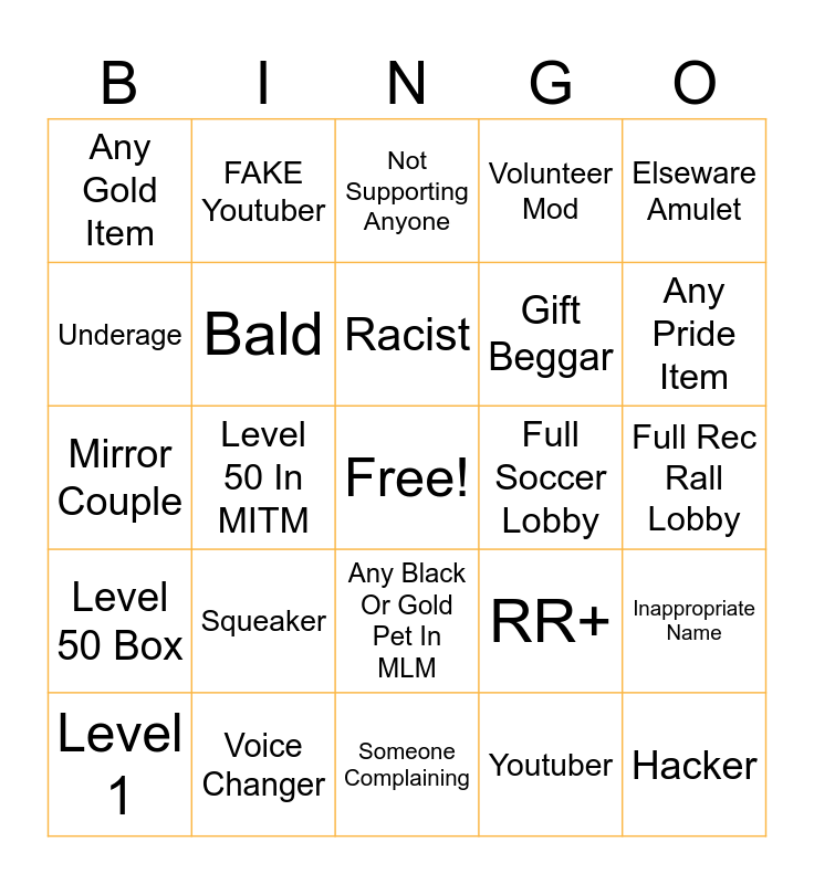 This bingo card has a free space and 24 words: Level 1, Squeaker, Racist, Youtuber, Elseware Amulet, Any Gold Item, FAKE Youtuber, Not Supporting Anyone, Full Soccer Lobby, Full Rec Rall Lobby, Mirror Couple, Bald, RR+, Inappropriate Name, Underage, Voice Changer, Someone Complaining, Volunteer Mod, Any Pride Item, Level 50 Box, Level 50 In MITM, Any Black Or Gold Pet In MLM, Gift Beggar and Hacker.