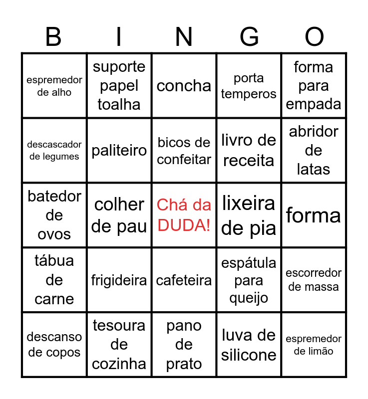 This bingo card has a free space and 65 words: espanador, tábua de carnes, escova de banheiro, carrinho de feira, cesta de pão, rolo de macarrão, suporte papel toalha, coador de chá, espátula para queijo, abridor de latas, descascador de legumes, pano de chão, pá de lixo, forma para empada, faca de pão, paliteiro, bicos de confeitar, porta temperos, moedor de pimenta, espremedor de alho, frigideira, pano de prato, lixeira de pia, garrafa témica, saleiro, filme plástico, xícara, desentupidor de pia, abridor de latas, rodo de pia, tesoura de cozinha, bacia de plástico, garrafa térmica, espanador, batedor de ovos, bicos de confeitar, Chá da DUDA, luva de silicone, escorredor de massa, travessa, colher de pau, cafeteira, jarra de vidro, escova para banheiro, porta guardanapos, coador de café, concha, ralador, espremedor de limão, tábua de carne, capacho, pires, prato, forma, forma de gelo, queijeira, avental, livro de receita, pegador de gelo, descanso de copos, porta detergente, porta sacos, peneira, bandeja and saca rolhas.