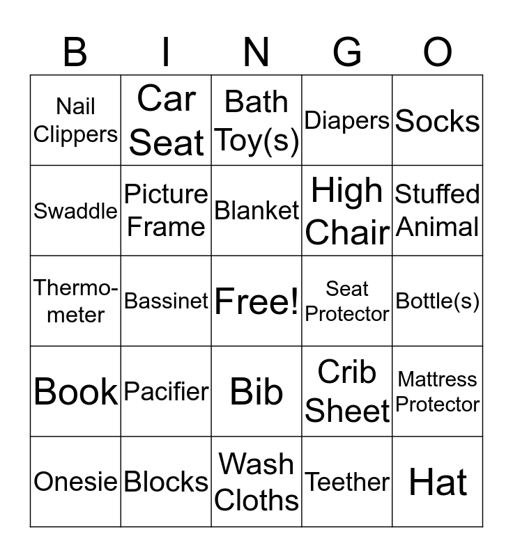This bingo card has a free space and 24 words: Pacifier, Blocks, Blanket, Onesie, Socks, Nail Clippers, Swaddle, Car Seat, Seat Protector, Bib, High Chair, Thermo-meter, Crib Sheet, Mattress Protector, Picture Frame, Teether, Bottle(s), Bath Toy(s), Stuffed Animal, Bassinet, Hat, Book, Diapers and Wash Cloths.