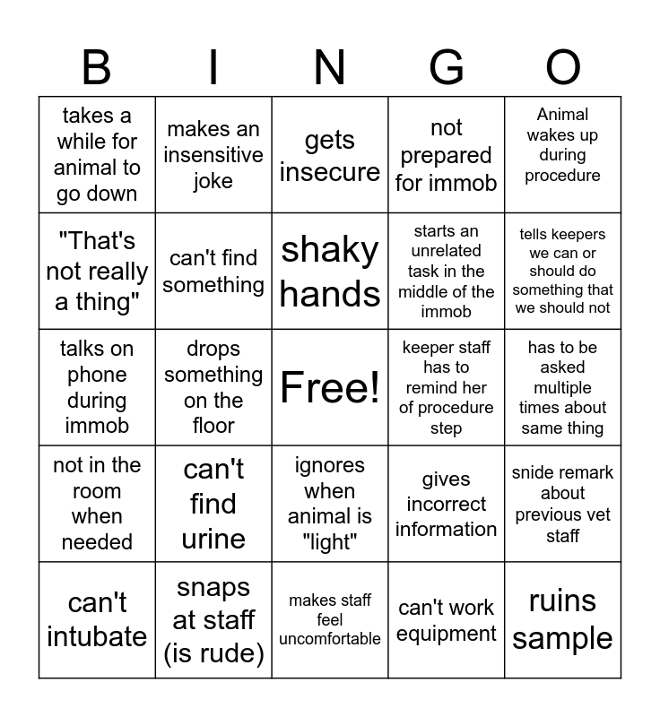 This bingo card has a free space and 24 words: can't find urine, snaps at staff (is rude), shaky hands, can't intubate, Animal wakes up during procedure, takes a while for animal to go down, "That's not really a thing", makes an insensitive joke, keeper staff has to remind her of procedure step, ignores when animal is "light", starts an unrelated task in the middle of the immob, talks on phone during immob, gives incorrect information, snide remark about previous vet staff, can't find something, can't work equipment, has to be asked multiple times about same thing, gets insecure, tells keepers we can or should do something that we should not, drops something on the floor, ruins sample, not in the room when needed, not prepared for immob and makes staff feel uncomfortable.