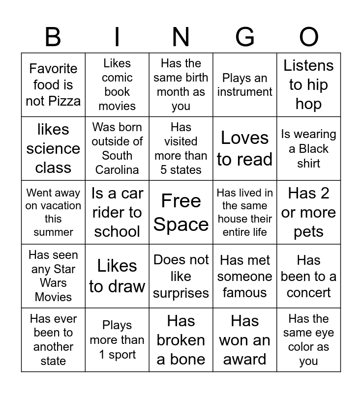 This bingo card has a free space and 29 words: Has ever been to another state, Has gotten sent home from school sick, Is a car rider to school, Has more than 2 siblings, Favorite food is not Pizza, Has the same birth month as you, Was born outside of South Carolina, Likes to draw, Has lived in the same house their entire life, Plays more than 1 sport, Has 2 or more pets, Has the same eye color as you, Has broken a bone, Has won an award, Is wearing a Black shirt, Loves to dance, Does not like surprises, Has seen any Star Wars Movies, Listens to hip hop, Went away on vacation this summer, Has met someone famous, Rides the bus to school, Loves to read, likes science class, Plays an instrument, Likes comic book movies, Has been to a concert, Has visited more than 5 states and Has used power tools.
