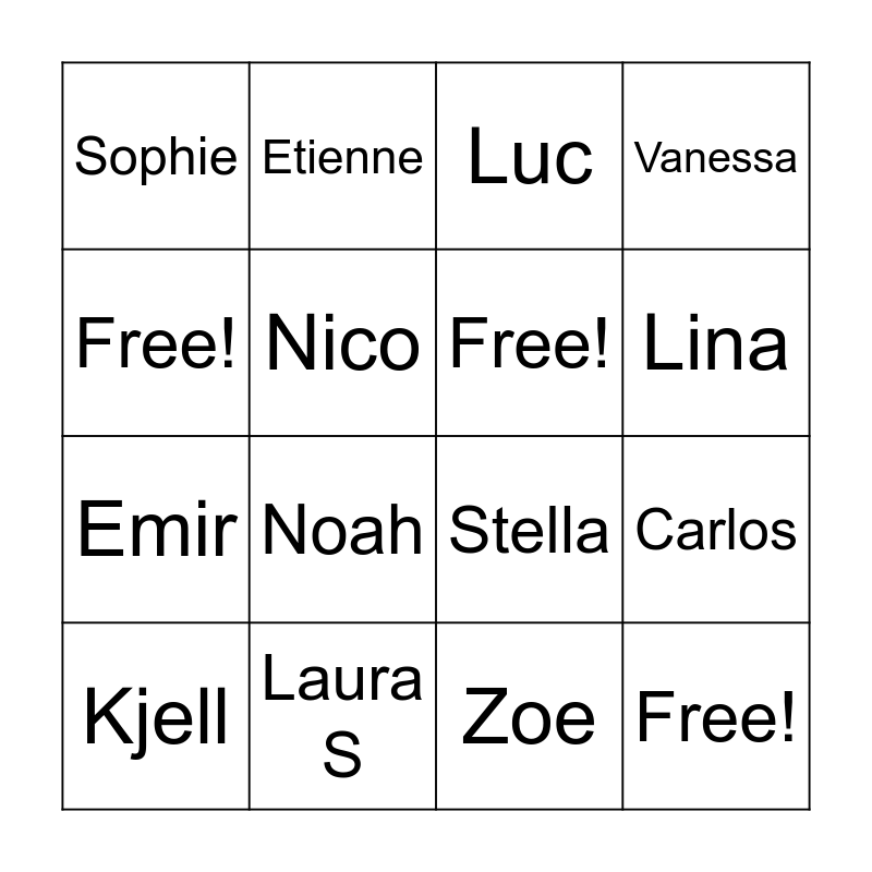 This bingo card has 16 words: Laura S, Carlos, Luc, Sophie, Emir, Etienne, Stella, Zoe, Free!, Nico, Kjell, Vanessa, Noah, Lina, Free! and Free!.