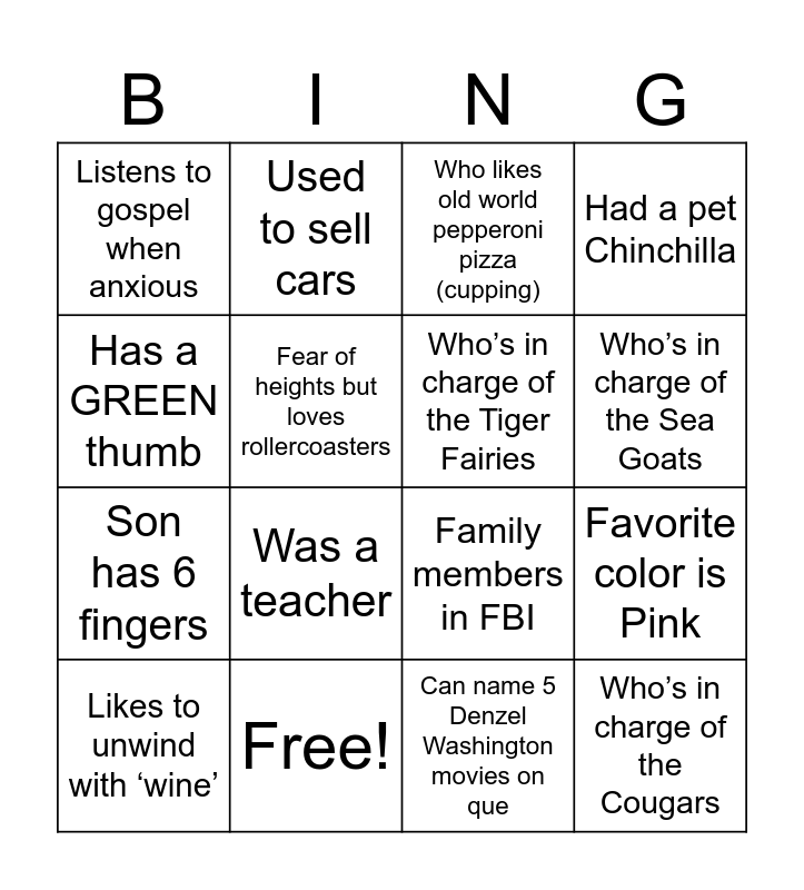 This bingo card has 16 words: Free!, Favorite color is Pink, Who likes old world pepperoni pizza (cupping), Listens to gospel when anxious, Son has 6 fingers, Used to sell cars, Family members in FBI, Can name 5 Denzel Washington movies on que, Has a GREEN thumb, Fear of heights but loves rollercoasters, Likes to unwind with ‘wine’, Had a pet Chinchilla, Was a teacher, Who’s in charge of the Sea Goats, Who’s in charge of the Tiger Fairies and Who’s in charge of the Cougars.