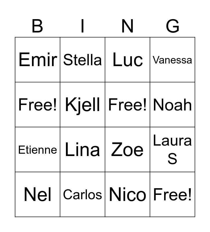 This bingo card has 16 words: Carlos, Laura S, Luc, Emir, Etienne, Stella, Zoe, Nico, Free!, Kjell, Nel, Vanessa, Lina, Noah, Free! and Free!.