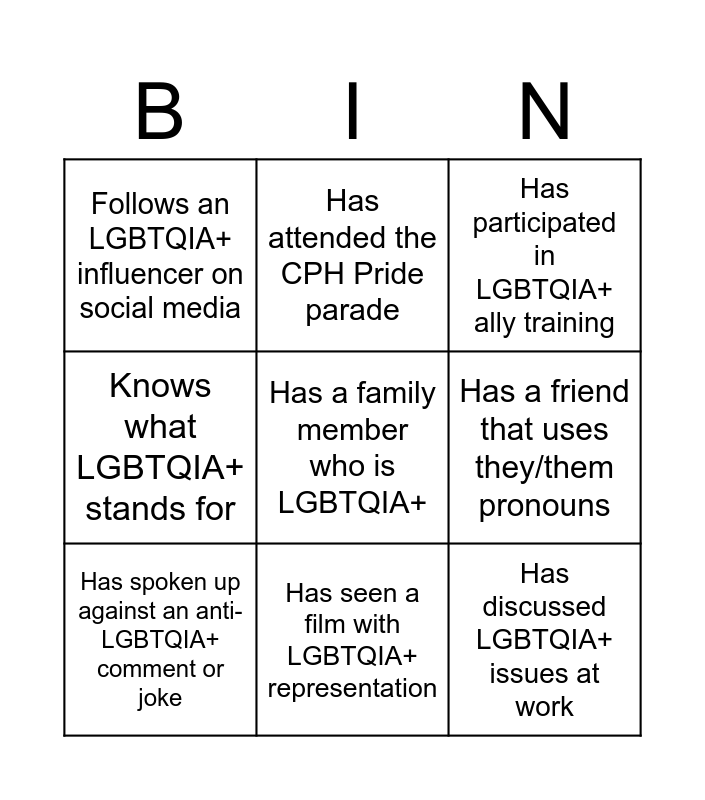 This bingo card has a free space and 8 words: Has a friend that uses they/them pronouns, Has participated in LGBTQIA+ ally training, Has attended the CPH Pride parade, Has spoken up against an anti-LGBTQIA+ comment or joke, Follows an LGBTQIA+ influencer on social media, Has discussed LGBTQIA+ issues at work, Knows what LGBTQIA+ stands for and Has seen a film with LGBTQIA+ representation.