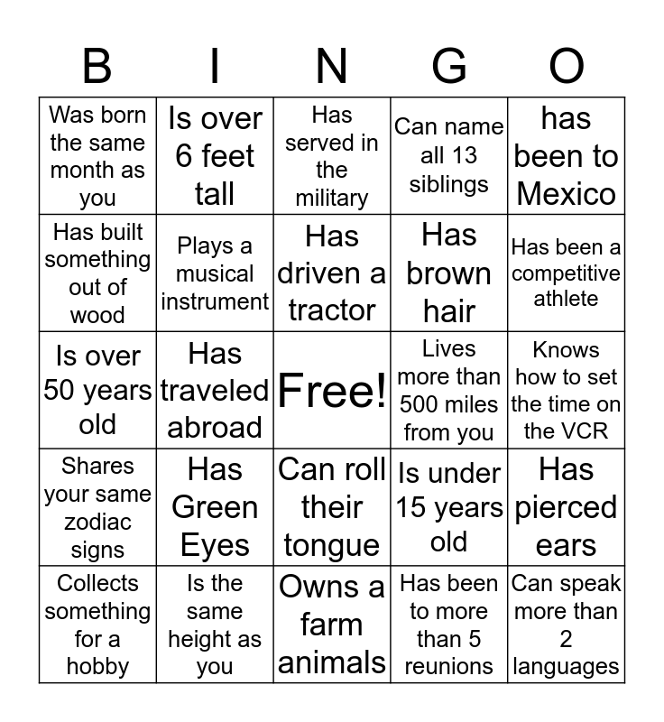 This bingo card has a free space and 24 words: Has Green Eyes, Is the same height as you, Has driven a tractor, Collects something for a hobby, has been to Mexico, Was born the same month as you, Has built something out of wood, Is over 6 feet tall, Lives more than 500 miles from you, Can roll their tongue, Has brown hair, Is over 50 years old, Is under 15 years old, Has pierced ears, Plays a musical instrument, Has been to more than 5 reunions, Knows how to set the time on the VCR, Has served in the military, Has been a competitive athlete, Has traveled abroad, Can speak more than 2 languages, Shares your same zodiac signs, Can name all 13 siblings and Owns a farm animals.