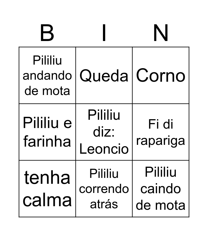 This bingo card has a free space and 8 words: Fi di rapariga, Corno, Queda, tenha calma, Pililiu andando de mota, Pililiu caindo de mota, Pililiu e farinha and Pililiu correndo atrás.
