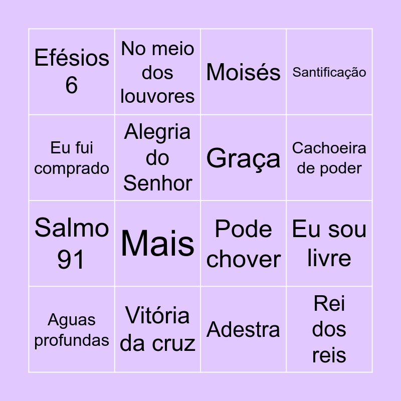 This bingo card has 20 words: Eu sou livre, Mil graus, Moisés, Sete trombetas, Aguas profundas, Eu fui comprado, Vitória da cruz, Efésios 6, Salmo 91, No meio dos louvores, Mais, Pode chover, Alegria do Senhor, Rei dos reis, Graça, 500 graus, Cachoeira de poder, Santificação, Adestra and Faraó ou Deus.