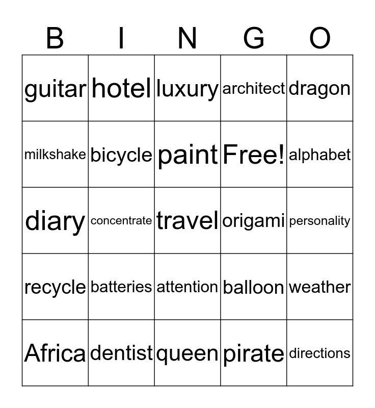 This bingo card has a free space and 24 words: batteries, dentist, paint, Africa, dragon, guitar, milkshake, hotel, origami, attention, Free!, diary, balloon, weather, bicycle, pirate, personality, luxury, alphabet, concentrate, directions, recycle, architect and queen.