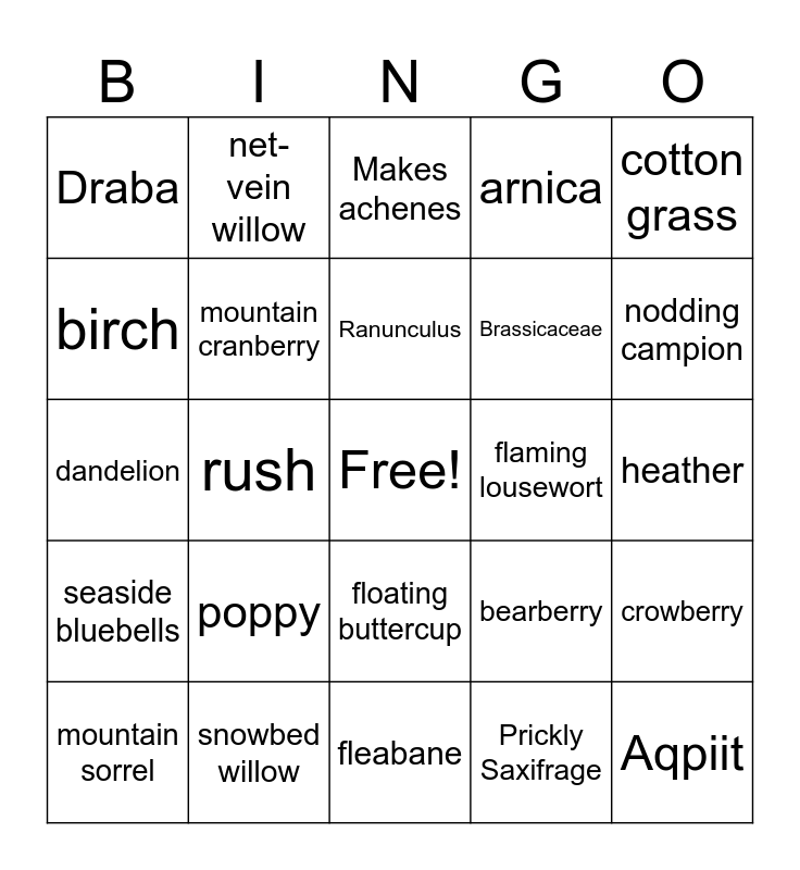 This bingo card has a free space and 53 words: territorial plant of Nunavut, Aqpiit, Dryas integrifolia, Prickly Saxifrage, poppy, mare's tail, net-vein willow, arctic willow, birch, fireweed, mountain cranberry, blueberry, crowberry, bearberry, tufted saxifrage, mountain sorrel, Ranunculus, flaming lousewort, Inuit peanuts, cotton grass, rush, grass, Brassicaceae, Draba, scurvy grass, snowbed willow, Salix, golden saxifrage, snow saxifrage, nodding campion, Stellaria, chickweed, moss campion, beach sandwort, Arctic pollinator!, Cerastium, arnica, fleabane, Makes achenes, Make berries, hairy lousewort, labrador tea, heather, potentilla, nodding saxifrage, floating buttercup, pincushion plant, arctic campion, dandelion, seaside bluebells, wintergreen, Ericaceae and arctic thrift.