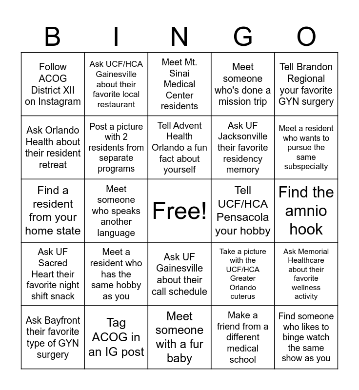 This bingo card has a free space and 24 words: Meet a resident who has the same hobby as you, Tag ACOG in an IG post, Tell Advent Health Orlando a fun fact about yourself, Ask Bayfront their favorite type of GYN surgery, Tell Brandon Regional your favorite GYN surgery, Follow ACOG District XII on Instagram, Ask Orlando Health about their resident retreat, Ask UCF/HCA Gainesville about their favorite local restaurant, Tell UCF/HCA Pensacola your hobby, Ask UF Gainesville about their call schedule, Ask UF Jacksonville their favorite residency memory, Find a resident from your home state, Take a picture with the UCF/HCA Greater Orlando cuterus, Ask Memorial Healthcare about their favorite wellness activity, Post a picture with 2 residents from separate programs, Make a friend from a different medical school, Find the amnio hook, Meet Mt. Sinai Medical Center residents, Meet a resident who wants to pursue the same subspecialty, Meet someone who speaks another language, Find someone who likes to binge watch the same show as you, Ask UF Sacred Heart their favorite night shift snack, Meet someone who's done a mission trip and Meet someone with a fur baby.