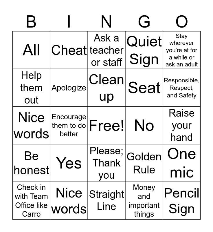 This bingo card has a free space and 24 words: Yes, Nice words, Clean up, Check in with Team Office like Carro, Stay wherever you're at for a while or ask an adult, All, Help them out, Cheat, No, Please; Thank you, Seat, Nice words, Golden Rule, One mic, Apologize, Money and important things, Raise your hand, Ask a teacher or staff, Responsible, Respect, and Safety, Encourage them to do better, Pencil Sign, Be honest, Quiet Sign and Straight Line.