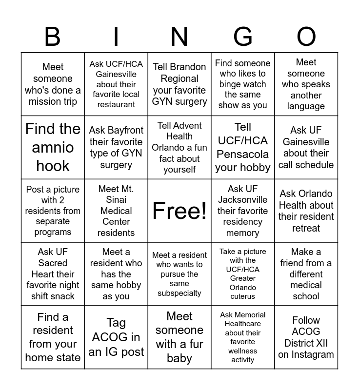 This bingo card has a free space and 24 words: Meet a resident who has the same hobby as you, Tag ACOG in an IG post, Tell Advent Health Orlando a fun fact about yourself, Find a resident from your home state, Meet someone who speaks another language, Meet someone who's done a mission trip, Find the amnio hook, Ask UCF/HCA Gainesville about their favorite local restaurant, Ask UF Jacksonville their favorite residency memory, Meet a resident who wants to pursue the same subspecialty, Tell UCF/HCA Pensacola your hobby, Post a picture with 2 residents from separate programs, Take a picture with the UCF/HCA Greater Orlando cuterus, Make a friend from a different medical school, Ask Bayfront their favorite type of GYN surgery, Ask Memorial Healthcare about their favorite wellness activity, Ask Orlando Health about their resident retreat, Tell Brandon Regional your favorite GYN surgery, Ask UF Gainesville about their call schedule, Meet Mt. Sinai Medical Center residents, Follow ACOG District XII on Instagram, Ask UF Sacred Heart their favorite night shift snack, Find someone who likes to binge watch the same show as you and Meet someone with a fur baby.