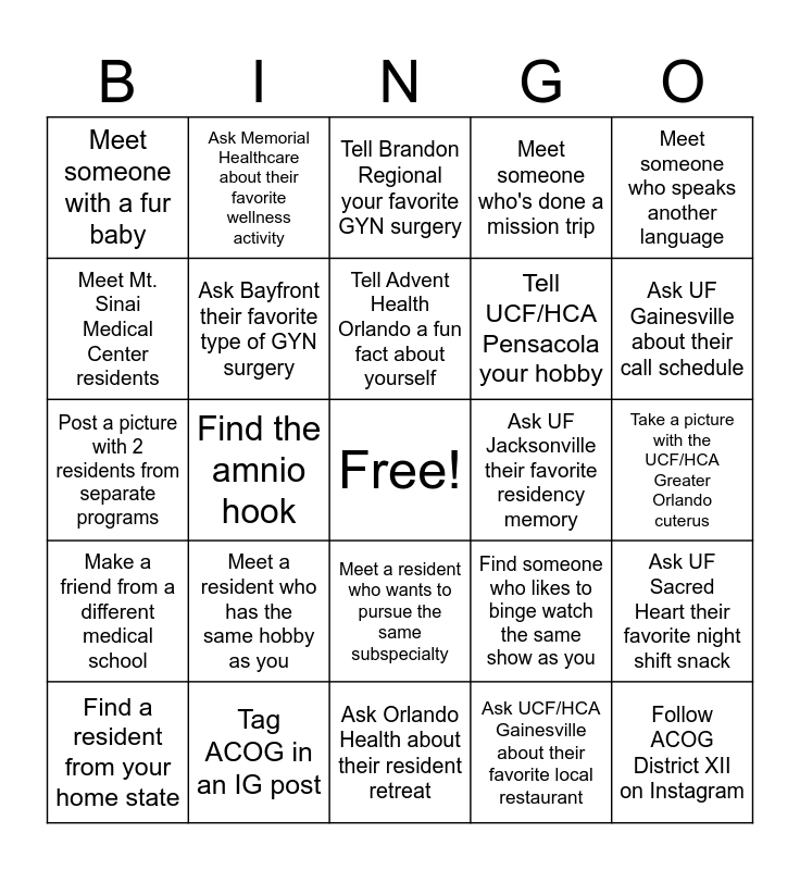 This bingo card has a free space and 24 words: Meet a resident who has the same hobby as you, Tag ACOG in an IG post, Tell Advent Health Orlando a fun fact about yourself, Find a resident from your home state, Meet someone who speaks another language, Meet someone with a fur baby, Meet Mt. Sinai Medical Center residents, Ask Memorial Healthcare about their favorite wellness activity, Ask UF Jacksonville their favorite residency memory, Meet a resident who wants to pursue the same subspecialty, Tell UCF/HCA Pensacola your hobby, Post a picture with 2 residents from separate programs, Find someone who likes to binge watch the same show as you, Ask UF Sacred Heart their favorite night shift snack, Ask Bayfront their favorite type of GYN surgery, Ask UCF/HCA Gainesville about their favorite local restaurant, Take a picture with the UCF/HCA Greater Orlando cuterus, Tell Brandon Regional your favorite GYN surgery, Ask UF Gainesville about their call schedule, Find the amnio hook, Follow ACOG District XII on Instagram, Make a friend from a different medical school, Meet someone who's done a mission trip and Ask Orlando Health about their resident retreat.