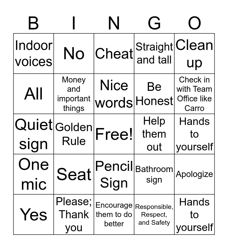 This bingo card has a free space and 24 words: Seat, Please; Thank you, Nice words, Yes, Clean up, Indoor voices, All, No, Help them out, Pencil Sign, Be Honest, Quiet sign, Bathroom sign, Apologize, Money and important things, Responsible, Respect, and Safety, Hands to yourself, Cheat, Check in with Team Office like Carro, Golden Rule, Hands to yourself, One mic, Straight and tall and Encourage them to do better.