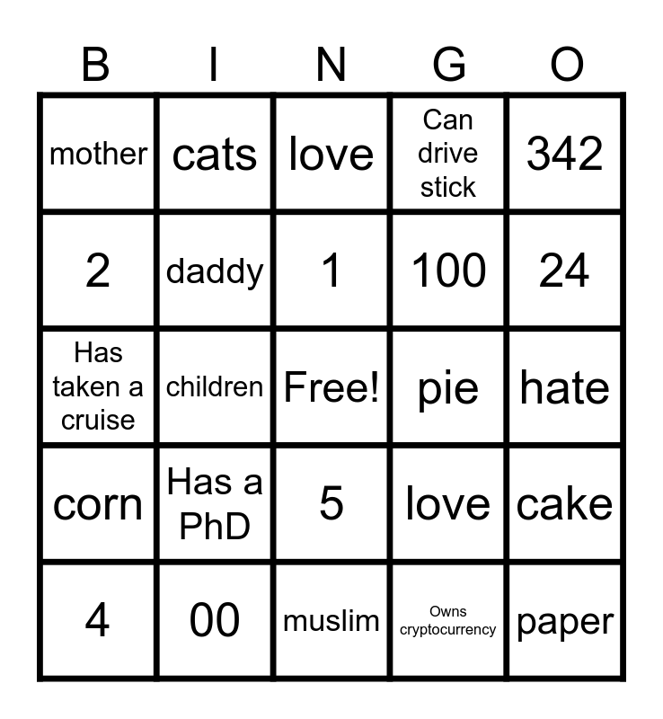 This bingo card has a free space and 24 words: Has a PhD, 00, 1, 4, 342, mother, 2, cats, pie, 5, 100, Has taken a cruise, love, cake, daddy, Owns cryptocurrency, hate, love, 24, children, paper, corn, Can drive stick and muslim.