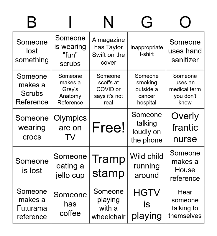 This bingo card has a free space and 24 words: Someone eating a jello cup, Someone has coffee, Someone scoffs at COVID or says it's not real, Someone makes a Futurama reference, Someone uses hand sanitizer, Someone lost something, Someone makes a Scrubs Reference, Someone is wearing "fun" scrubs, Someone talking loudly on the phone, Tramp stamp, Someone smoking outside a cancer hospital, Someone wearing crocs, Wild child running around, Someone makes a House reference, Someone makes a Grey's Anatomy Reference, HGTV is playing, Overly frantic nurse, A magazine has Taylor Swift on the cover, Someone uses an medical term you don't know, Olympics are on TV, Hear someone talking to themselves, Someone is lost, Inappropriate t-shirt and Someone playing with a wheelchair.