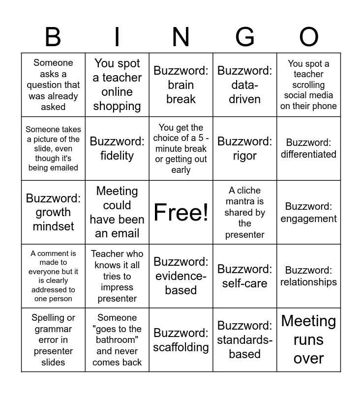 This bingo card has a free space and 24 words: Teacher who knows it all tries to impress presenter, Someone "goes to the bathroom" and never comes back, You get the choice of a 5 - minute break or getting out early, Spelling or grammar error in presenter slides, You spot a teacher scrolling social media on their phone, Someone asks a question that was already asked, Someone takes a picture of the slide, even though it's being emailed, You spot a teacher online shopping, A cliche mantra is shared by the presenter, Buzzword: evidence-based, Buzzword: rigor, Buzzword: growth mindset, Buzzword: self-care, Buzzword: relationships, Buzzword: fidelity, Buzzword: standards-based, Buzzword: engagement, Buzzword: brain break, Buzzword: differentiated, Meeting could have been an email, Meeting runs over, A comment is made to everyone but it is clearly addressed to one person, Buzzword: data-driven and Buzzword: scaffolding.