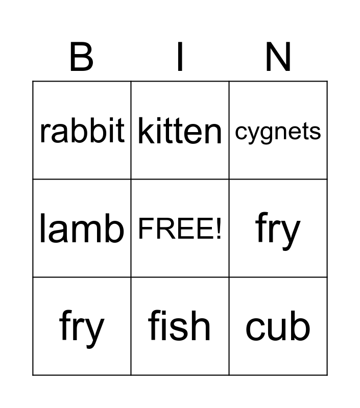 This bingo card has a free space and 24 words: deer, lion, fish, fawn, cub, rabbit, fry, kitten, joey, squabs, kitten, fawn, cub, whale, fry, hatchling, swan, cygnets, hedgehog, hoglet, joey, sheep, lamb and hen.