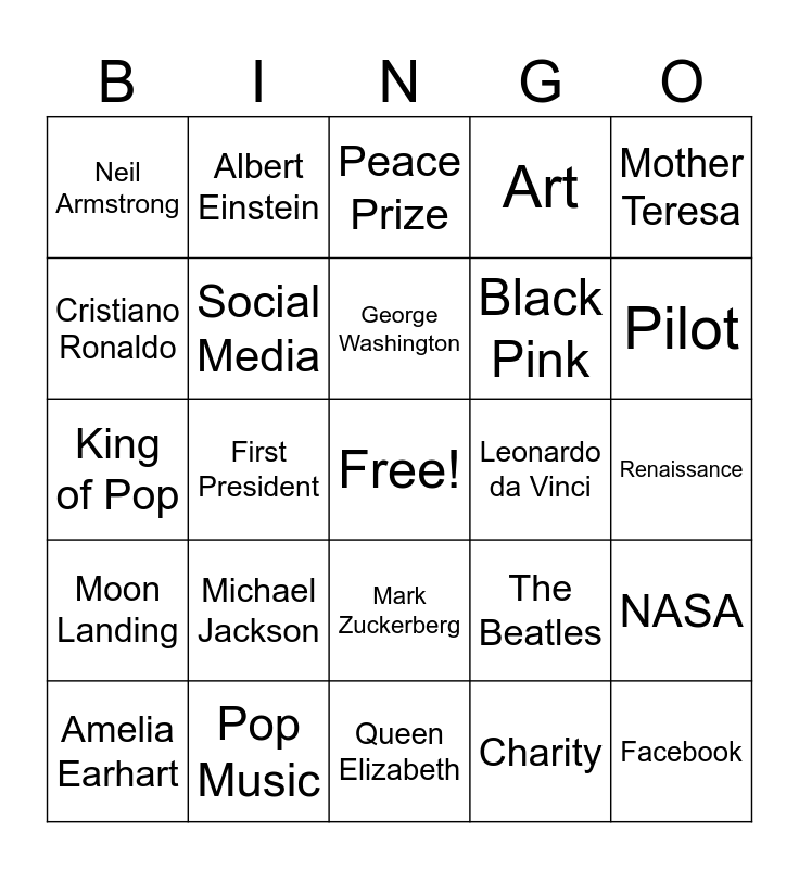 This bingo card has a free space and 25 words: Michael Jackson, Queen Elizabeth, George Washington, Amelia Earhart, Mother Teresa, Neil Armstrong, Cristiano Ronaldo, Albert Einstein, Leonardo da Vinci, Mark Zuckerberg, Black Pink, King of Pop, The Beatles, NASA, Social Media, Football, Renaissance, Peace Prize, Pilot, First President, Facebook, Pop Music, Moon Landing, Art and Charity.