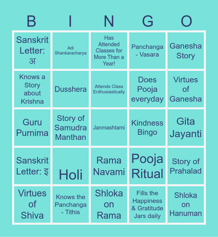 This bingo card has 25 words: Holi, Shloka on Rama, Attends Class Enthusiastically, Virtues of Shiva, Ganesha Story, Sanskrit Letter: अ, Knows a Story about Krishna, Adi Shankaracharya, Kindness Bingo, Rama Navami, Does Pooja everyday, Guru Purnima, Pooja Ritual, Story of Prahalad, Dusshera, Shloka on Hanuman, Gita Jayanti, Has Attended Classes for More Than a Year!, Virtues of Ganesha, Story of Samudra Manthan, Janmashtami, Knows the Panchanga - Tithis, Sanskrit Letter: इ, Panchanga - Vasara and Fills the Happiness & Gratitude Jars daily.
