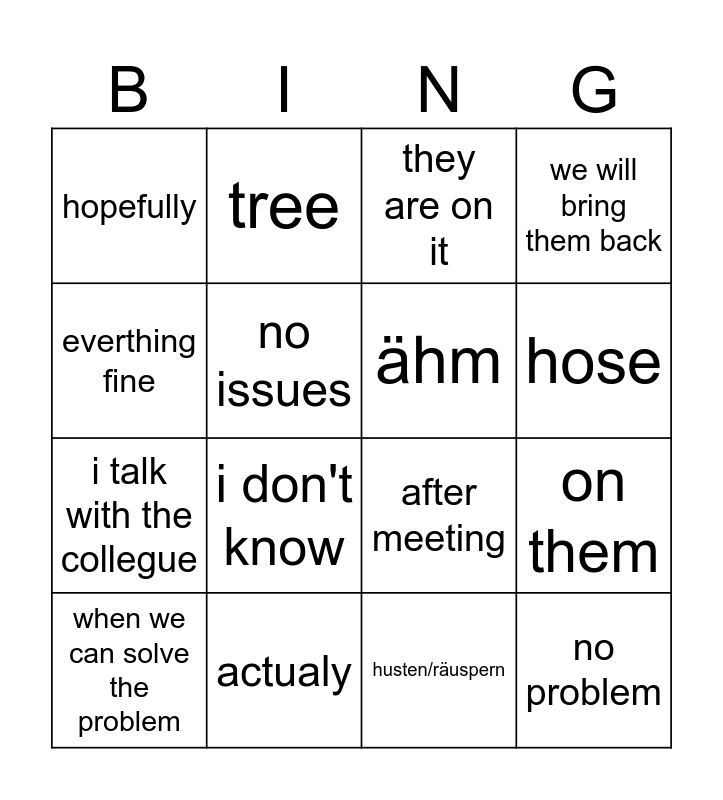 This bingo card has 16 words: actualy, on them, they are on it, hopefully, i talk with the collegue, tree, after meeting, husten/räuspern, everthing fine, no issues, when we can solve the problem, we will bring them back, i don't know, hose, ähm and no problem.