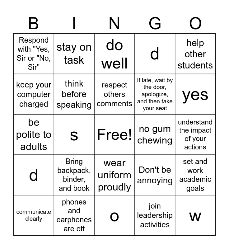 This bingo card has a free space and 24 words: Bring backpack, binder, and book, phones and earphones are off, respect others comments, communicate clearly, help other students, Respond with "Yes, Sir or "No, Sir", keep your computer charged, stay on task, no gum chewing, wear uniform proudly, If late, wait by the door, apologize, and then take your seat, be polite to adults, Don't be annoying, set and work academic goals, think before speaking, join leadership activities, understand the impact of your actions, do well, yes, s, w, d, d and o.