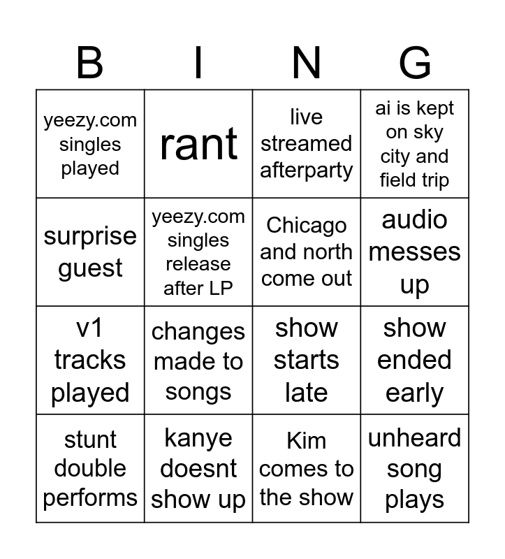 This bingo card has 16 words: kanye doesnt show up, show ended early, live streamed afterparty, yeezy.com singles played, v1 tracks played, rant, show starts late, Kim comes to the show, surprise guest, yeezy.com singles release after LP, stunt double performs, ai is kept on sky city and field trip, changes made to songs, audio messes up, Chicago and north come out and unheard song plays.