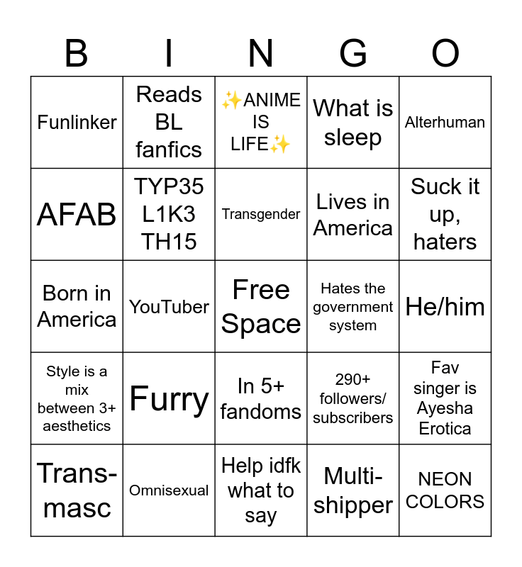 This bingo card has a free space and 24 words: Furry, Omnisexual, Transgender, Trans-masc, Alterhuman, Funlinker, AFAB, Reads BL fanfics, Hates the government system, In 5+ fandoms, Lives in America, Born in America, 290+ followers/ subscribers, Fav singer is Ayesha Erotica, TYP35 L1K3 TH15, Multi-shipper, He/him, ✨ANIME IS LIFE✨, Suck it up, haters, YouTuber, NEON COLORS, Style is a mix between 3+ aesthetics, What is sleep and Help idfk what to say.