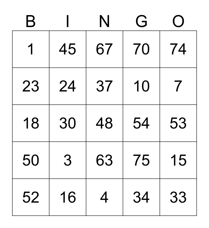 This bingo card has a free space and 24 words: 3, 16, 37, 52, 74, 1, 23, 45, 54, 63, 10, 18, 75, 15, 24, 34, 53, 67, 7, 30, 33, 50, 70 and 4.