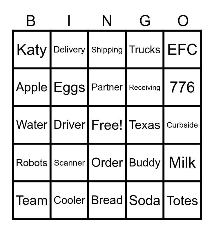 This bingo card has a free space and 24 words: Team, Scanner, Partner, Soda, EFC, Katy, Delivery, Shipping, Texas, Curbside, Water, Eggs, Buddy, Milk, Apple, Cooler, Bread, Trucks, 776, Robots, Driver, Order, Receiving and Totes.