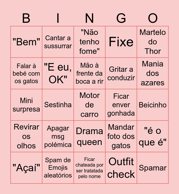 This bingo card has 25 words: Revirar os olhos, Spam de Emojis aleatórios, Motor de carro, Outfit check, Martelo do Thor, "Bem", Cantar a sussurrar, "Não tenho fome", Ficar enver gonhada, "é o que é", Falar à bebé com os gatos, "E eu, OK", Ficar chateada por ser tratatada pelo nome, Mandar foto dos gatos, Mania dos azares, "Açaí", Sestinha, Mão à frente da boca a rir, Gritar a conduzir, Beicinho, Mini surpresa, Apagar msg polémica, Drama queen, Fixe and Spamar.