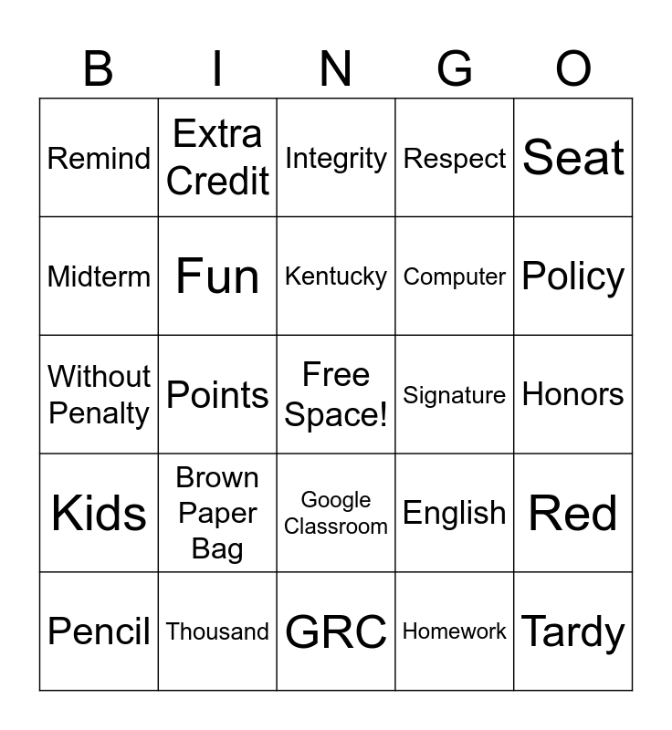 This bingo card has a free space and 28 words: Red, Team, Computer, Homework, Midterm, Integrity, Extra Credit, Kids, Signature, Pencil, Without Penalty, Respect, Thousand, GRC, Policy, Folder, Brown Paper Bag, Fun, Kentucky, Google Classroom, Remind, Research, Tardy, Points, Honors, English, Seat and Candy.