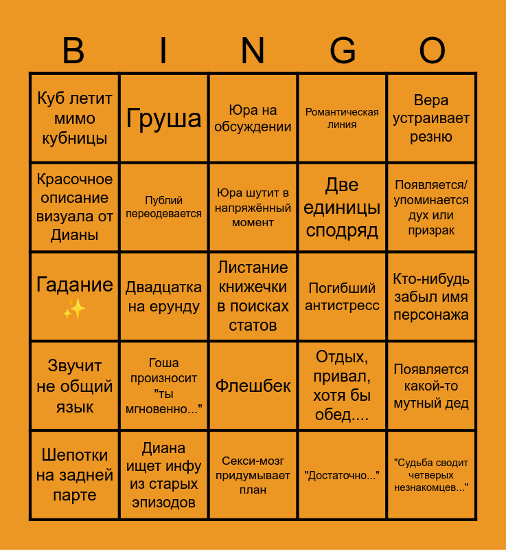 This bingo card has 25 words: Гоша произносит "ты мгновенно...", Секси-мозг придумывает план, Юра шутит в напряжённый момент, Шепотки на задней парте, Вера устраивает резню, Куб летит мимо кубницы, Красочное описание визуала от Дианы, Груша, Погибший антистресс, Флешбек, Две единицы сподряд, Гадание ✨, Отдых, привал, хотя бы обед...., Появляется какой-то мутный дед, Публий переодевается, "Судьба сводит четверых незнакомцев...", Кто-нибудь забыл имя персонажа, Юра на обсуждении, Появляется/упоминается дух или призрак, Двадцатка на ерунду, Листание книжечки в поисках статов, Диана ищет инфу из старых эпизодов, Звучит не общий язык, Романтическая линия and "Достаточно...".