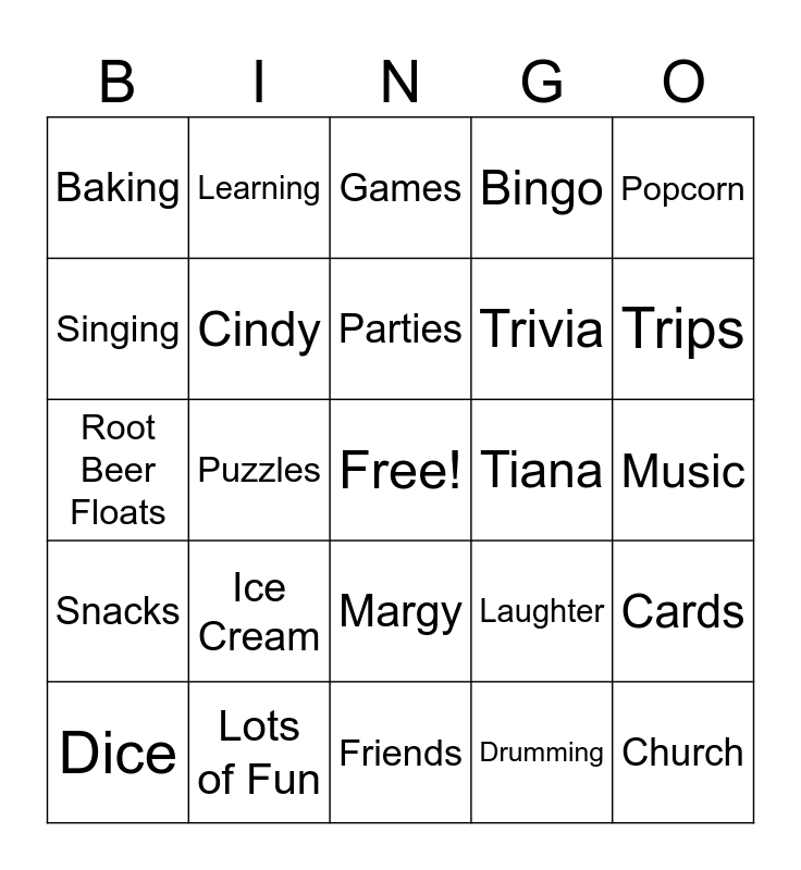 This bingo card has a free space and 30 words: Lots of Fun, Crafts, Puzzles, Manicures, Baking, Games, Cindy, Margy, Tiana, Friends, Music, Church, Drumming, Water Guns, Trips, Movies, Laughter, Snacks, Ice Cream, Popcorn, Root Beer Floats, Exercises, Learning, Trivia, Singing, Bingo, Cards, Dice, Parties and Entertainment.