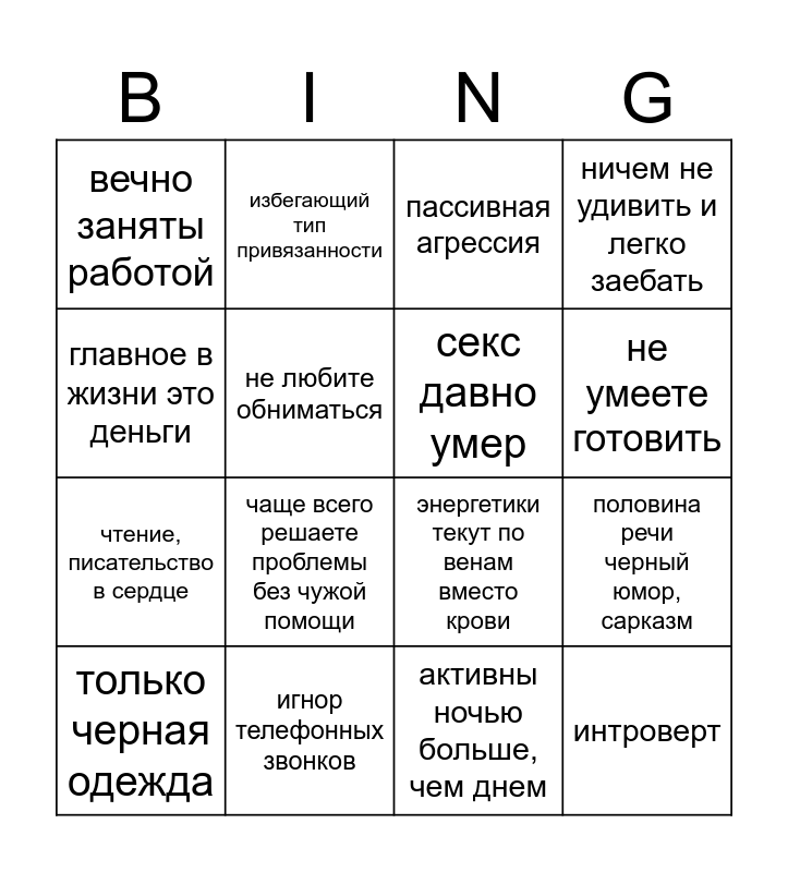This bingo card has 16 words: игнор телефонных звонков, половина речи черный юмор, сарказм, пассивная агрессия, вечно заняты работой, чтение, писательство в сердце, избегающий тип привязанности, энергетики текут по венам вместо крови, активны ночью больше, чем днем, главное в жизни это деньги, не любите обниматься, только черная одежда, ничем не удивить и легко заебать, чаще всего решаете проблемы без чужой помощи, не умеете готовить, секс давно умер and интроверт.