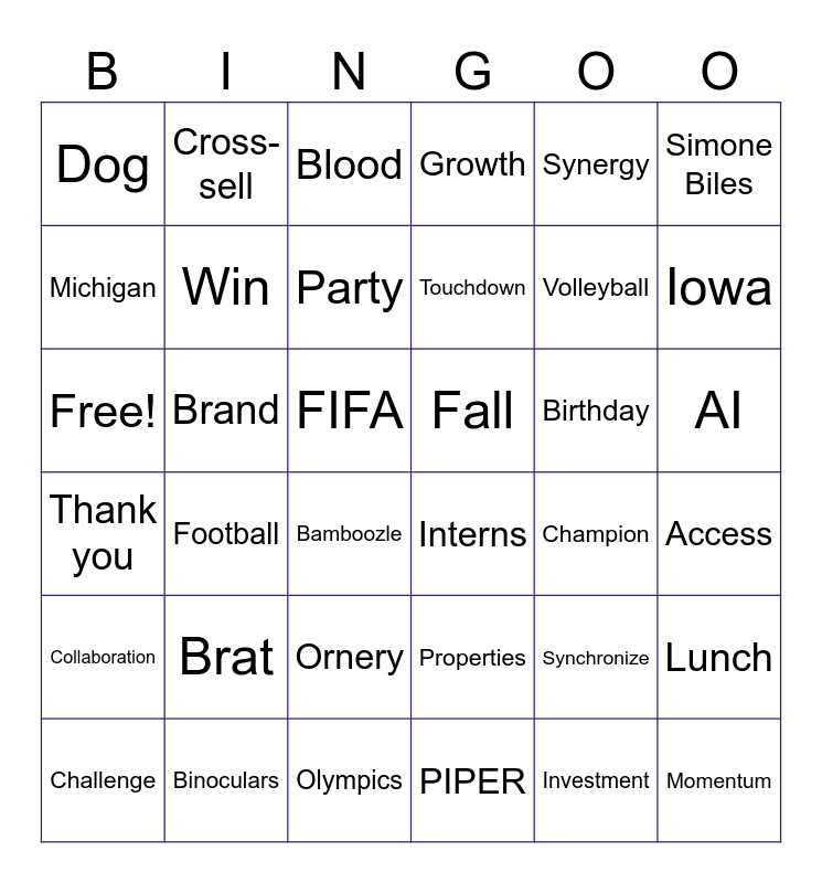 This bingo card has 36 words: Properties, Ornery, PIPER, Michigan, Thank you, Fall, Win, Olympics, Synergy, Synchronize, Iowa, Growth, Lunch, Brand, Touchdown, Dog, Collaboration, Birthday, Free!, Blood, FIFA, Football, Interns, Bamboozle, Champion, Cross-sell, Volleyball, Binoculars, Party, Simone Biles, Momentum, Challenge, Access, AI, Brat and Investment.