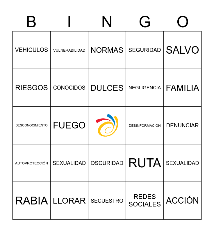 This bingo card has a free space and 182 words: CALLES, PELIGRO, PROTECCIÓN, AUTOCUIDADO, RIESGOS, FUEGO, INSEGURIDAD, VIOLENCIA, DESCONOCIDO, CORRER, CONFIANZA, OSCURIDAD, DULCES, SEGURIDAD, DESCONOCIMIENTO, DESCONFIANZA, DESINFORMACIÓN, INFLUENCIA, AMISTAD, AUTOPROTECCIÓN, NORMAS, AUTORIDAD, CONOCIDOS, ALERTA, AYUDA, INTEGRIDAD, VIDA, FAMILIA, SALVO, CUIDADO, NO, CONCIENTE, RESPETO, VALORES, BROMAS, ATENCIÓN, CONTROL, CASA, AGRESIÓN, DECISIÓN, COMUNICACIÓN, GRITAR, DENUNCIAR, CONOCIMIENTO, DINERO, ACCIÓN, AMENAZA, MIEDO, VULNERABILIDAD, CURIOSIDAD, RABIA, LLORAR, MANOSEO, GRAVEDAD, ABUSO, URGENCIA, CULPA, RUTA, PROTEGERME, DAÑOS, REDES SOCIALES, DESPLAZAMIENTO, SECUESTRO, SUFRIMIENTO, DUELO, TRAUMA, CONSECUENCIA, PRECAUCIÓN, EVITAR, NEGLIGENCIA, NIÑOS Y NIÑAS, ADOLESCENTES, EXTRAÑOS, VIOLACIÓN, REGALOS, CHANTAJE, MANIPULACIÓN, VEHICULOS, ARMAS, CARICIAS, PROHIBIDO, CONSENTIMIENTO, CUERPO, SILENCIO, SECRETOS, ADULTOS, EDCUCACIÓN, SEXUALIDAD, LIMITES, CUIDARSE, INFLUENCIA, RIESGOS, PROTEGERME, REDES SOCIALES, PREVENCIÓN, RESPETO, GRITAR, INTEGRIDAD, CUIDADO, RUTA, CONFIANZA, CHANTAJE, FAMILIA, SECUESTRO, EVITAR, PELIGRO, MANIPULACIÓN, DINERO, GRAVEDAD, EDCUCACIÓN, NO, EXTRAÑOS, SECRETOS, ADOLESCENTES, COMUNICACIÓN, TRAUMA, REACCIÓN, INSEGURIDAD, CONOCIDOS, CUERPO, AUTOPROTECCIÓN, LLORAR, CUIDARSE, PROHIBIDO, DECISIÓN, CONSENTIMIENTO, AMENAZA, CULPA, CONOCIMIENTO, LIMITES, BROMAS, NEGLIGENCIA, AUTOCUIDADO, VEHICULOS, FUEGO, AGRESIÓN, ATENCIÓN, ABUSO, PRECAUCIÓN, VALORES, DAÑOS, DESCONOCIDO, OSCURIDAD, CALLES, NIÑOS Y NIÑAS, URGENCIA, VIDA, DESPLAZAMIENTO, REGALOS, DESCONOCIMIENTO, VIOLENCIA, CONCIENTE, DUELO, CORRER, SEGURIDAD, NORMAS, VIOLACIÓN, MANOSEO, CASA, CONSECUENCIA, CONTROL, AMISTAD, ACCIÓN, PROTECCIÓN, DESCONFIANZA, DULCES, VULNERABILIDAD, SEXUALIDAD, DESINFORMACIÓN, MIEDO, ARMAS, CURIOSIDAD, CARICIAS, DENUNCIAR, AYUDA, SALVO, ADULTOS, SILENCIO, SUFRIMIENTO, RABIA, ALERTA and AUTORIDAD.