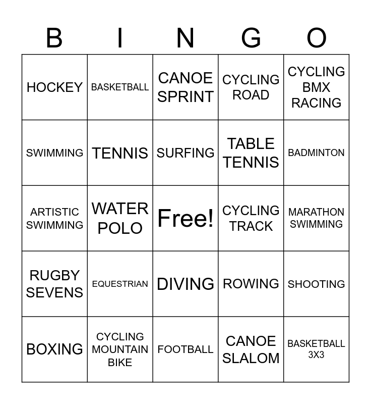 This bingo card has a free space and 45 words: ARCHERY, BASKETBALL 3X3, BEACH VOLLEYBALL, BOXING, BREAKING, CANOE SLALOM, CANOE SPRINT, CYCLING BMX FREESTYLE, CYCLING BMX RACING, CYCLING MOUNTAIN BIKE, CYCLING ROAD, CYCLING TRACK, DIVING, EQUESTRIAN, FENCING, FOOTBALL, ARTISTIC GYMNASTICS, ARTISTIC SWIMMING, ATHLETICS, BADMINTON, BASKETBALL, GOLF, HANDBALL, HOCKEY, JUDO, MARATHON SWIMMING, MODERN PENTATHLON, RHYTHMIC GYMNASTICS, ROWING, RUGBY SEVENS, SAILING, SHOOTING, SKATEBOARDING, TRIATHLON, VOLLEYBALL, WATER POLO, WEIGHTLIFTING, WRESTLING, SPORT CLIMBING, SURFING, SWIMMING, TABLE TENNIS, TAEKWONDO, TENNIS and TRAMPOLINE.
